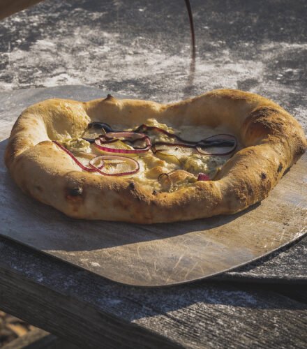 For this fantastic, simple pizza, start by making a fire in the oven and heating it up to about 400/450°C. Slice the pears as thin as you can. Do the same with the onions.