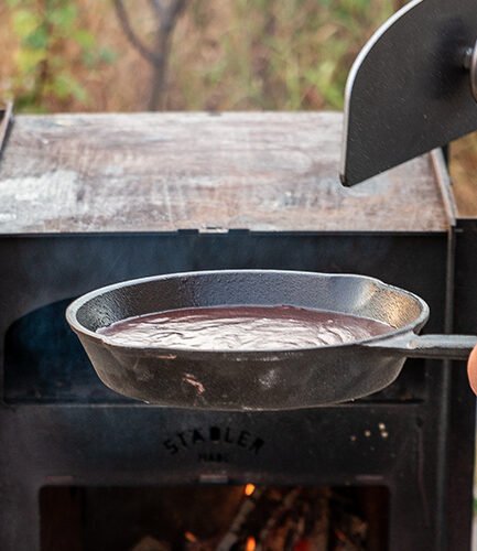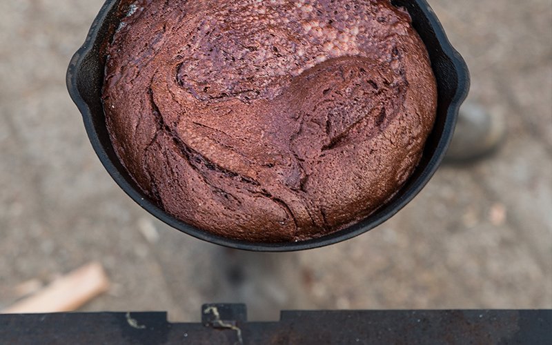 This is the most delicious cake recipe ever. Put a pan on top of your outdoor oven. Melt the butter, sugar, and chocolate together. When this is done, add the eggs one by one, mix thoroughly, and pour it into a cake tin or, in this case, a cast iron pan. If you want to be sure the cake won’t stick, place some baking paper on the bottom of your tin or pan. Cook in the Outdoor Oven for about 15 minutes, turning it around once in a while. With this cake, it is very handy to use the thermo door, so you can close the baking compartment and see the temperature.