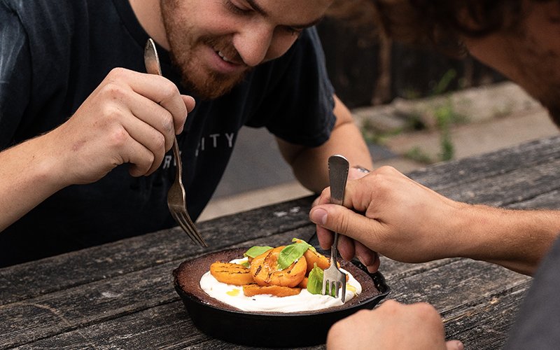 It is very important to keep the temperature stable somewhere between 150°C and 190°C. To achieve a stable temperature, make sure to chop your wood very small and add a piece every 5 to 10 minutes. After that baby comes out, you are going to be so happy!! But first, let it cool down for about 20 minutes, and then you are ready to dig in. The last time I made this recipe, I spread crème fraîche on the cake and covered it with grilled peaches and basil, and I added a bit of lemon curd. Mamma Mia! But you can eat it however you like. Enjoy!