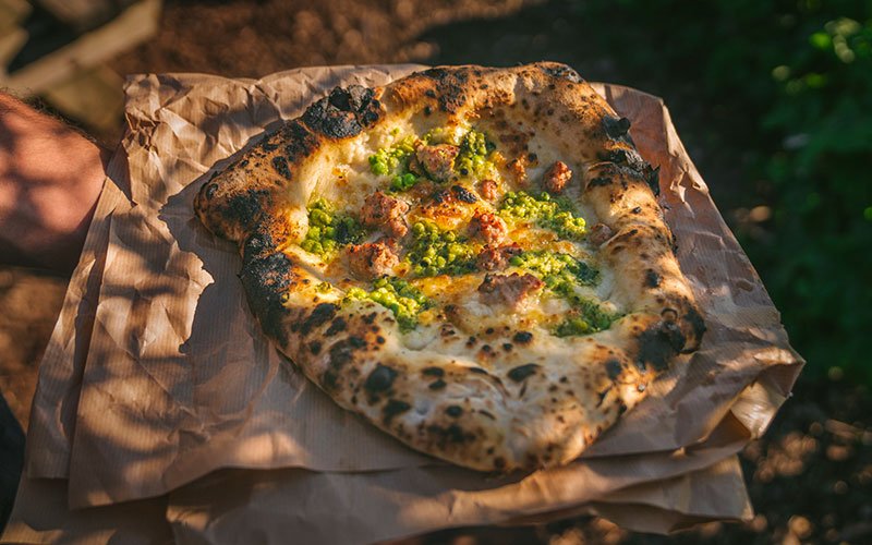 Take a dough ball, shape your pizza, and sprinkle it with grated Gouda cheese (check out my tutorial on how to stretch pizza dough). Then spread out the sausage pieces and use a spoon to sparsely add some pea purée on the pizza. Drizzle a little bit of olive oil on top and you’re ready to bake! While baking, keep a close eye on your pizza and make sure to rotate it frequently. When it’s ready, sprinkle some black pepper on top and optionally some fresh basil leaves. The rich and fatty flavor of the sausage combines really well with the freshness of the pea purée.