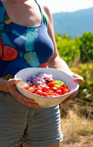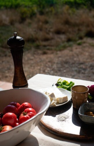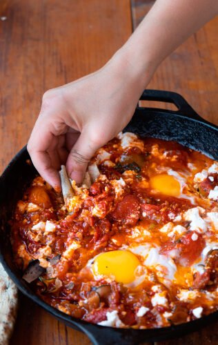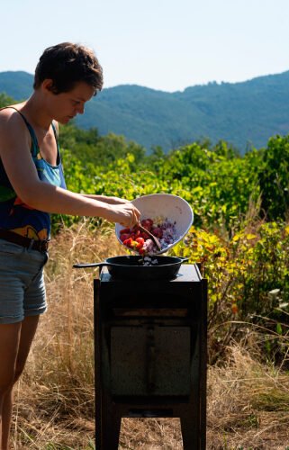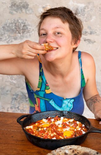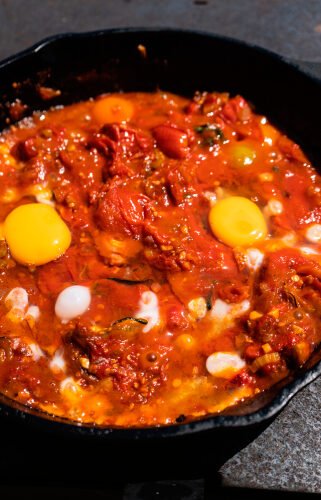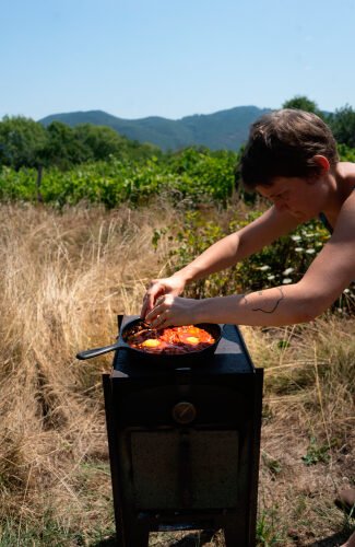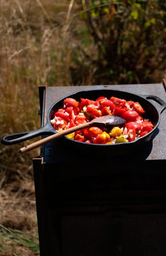 Eggs poached in a rich, spicy tomato-based stew, dotted with feta cheese and olive oil… I have not yet met someone to resist the mix! Switch up the spices (ras-el-hanout will be great, use some chili if you like a kick, some dried herbs such as oregano) and use up what you have: some sad-looking greens or the weird end of a zucchini can find their way to the pan. Start by chopping everything: the garlic finely, the onion and celery branch in thin slices, the red pepper (if using fresh) in rough slices, and the tomatoes in 4/6 pieces depending on the size of your tomatoes. When you have all the ingredients ready, start your fire. Place a cast-iron pan on top of the oven, pour the olive oil and the spices and leave to sizzle a bit. When they start to smell fragrant, add all of the vegetables mentioned above at once and sprinkle with salt.