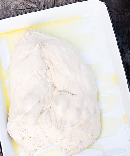 Make your dough using the pizza dough calculator set to Sicilian pizza. Click here to make (Sicilian) pizza dough.