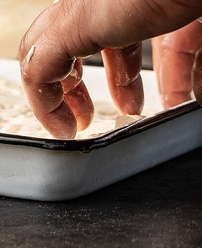Let the dough sit in the baking tray for at least 4 to 6 hours, so that it comes to room temperature. After this time has passed, heat up your Outdoor Oven with a big fire let it burn for a while until the flames are small and not really active anymore. Put on the Thermodoor and the bottom door. When the temperature drops down to 250ºC, it means it’s ready.